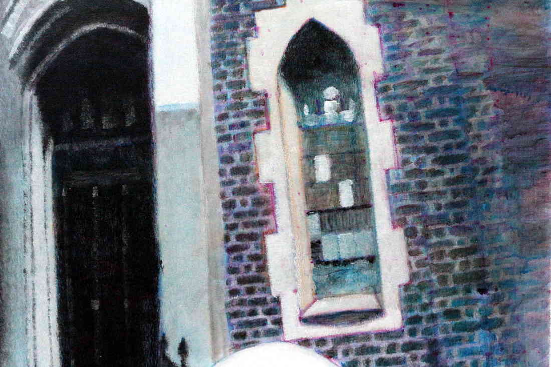 It's raining and people are running for shelter. The threshold at the top of the stairs indicates a transition from one reality to another. Perhaps from this temporary reality to the eternal afterlife. Or perhaps we could see it as Dante's Mount Purgatory. Some people seem to be stumbling over what appears to be a third leg, while others seem to be sailing swiftly along. Or are they, on closer inspection, slipping on the wet surface? And some have made it, as it were, they have completed their trials and are being let in.