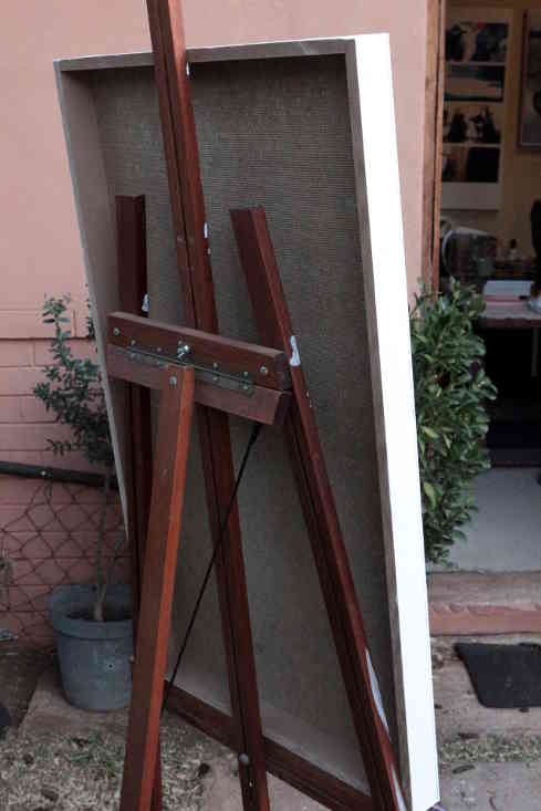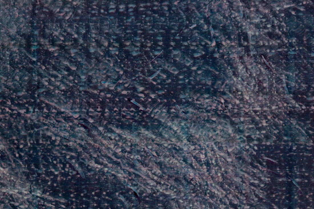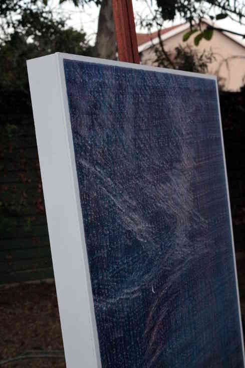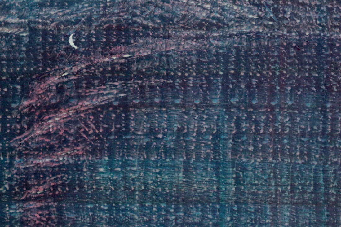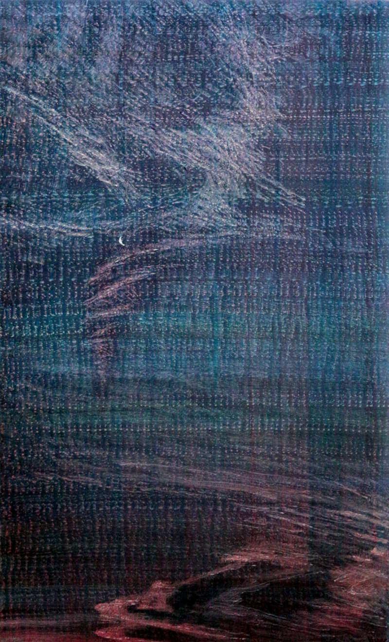 In the therapeutic ripples of this allegorical vision I see what appears to be two celestial beings acting out their sublime narrative. The loose weave of the surface is breaking apart, giving a glimpse of the 'reality' that lies behind. At a distance far away on the horizon is a hazy dragon-like cloud formation, which appears to have two faces. The first face seems brash and hot-blooded, while the second face seems older, calmer and wiser. He has just absorbed a stinging blow from the creature above, her tail-sting still red from the aggressive assault. The staggered brush strokes seem to create small shimmering waves in the ’depths’ behind the surface giving slight animation to the she-beast in the sky. But her assault is salutary because it causes him to grow from the brash youth into fruitful maturity.