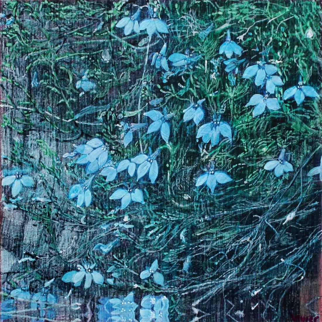 On an early spring day I noticed these flowers in my mother’s garden and saw something in them. I don’t know what exactly. I fetched my camera, took a photo and started to paint it. As I spent more time with this image new patterns and narratives emerged. I noticed that the flowers were quite moth-like or elfish, with wings and a pair of glowing aggressive eyes. They seemed quite mischievous and hypnotic too. They seemed to be slowly drifting downwards towards the bottom frame, where there is a strange disruption of simulacra that could be interpreted as a pool of water, or perhaps as a glimpse of what lies beyond the frame.